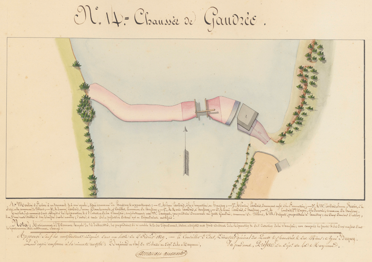 Découvrez l'atlas des chaussées et portes marinières de la basse Mayenne (de Laval à Daon) datant de 1829. Réalisé par l'administration des Ponts et Chaussées à la suite d'une ordonnance royale de 1826, son objectif était de clarifier les responsabilités de l'État et des usagers (meuniers, bateliers, etc.) dans l'entretien des portes marinières (ancêtres de nos écluses actuelles).