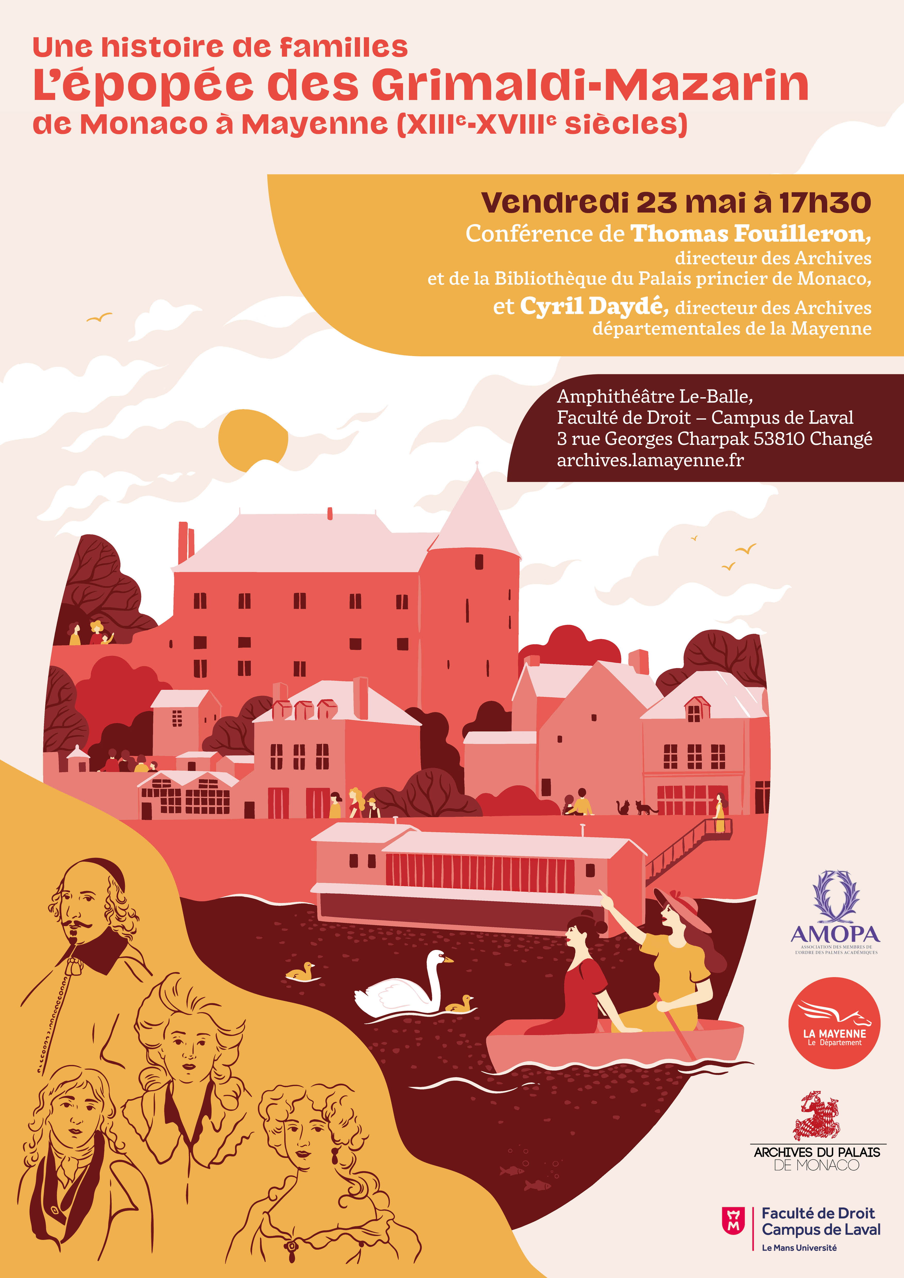 "Une histoire de familles. L'épopée des Grimaldi-Mazarin, de Monaco à Mayenne (XIIIe-XVIIIe siècles)" par Thomas FOUILLERON, directeur des Archives et de la Bibliothèque du Palais princier de Monaco et Cyril DAYDÉ, directeur des Archives départementales de la Mayenne.