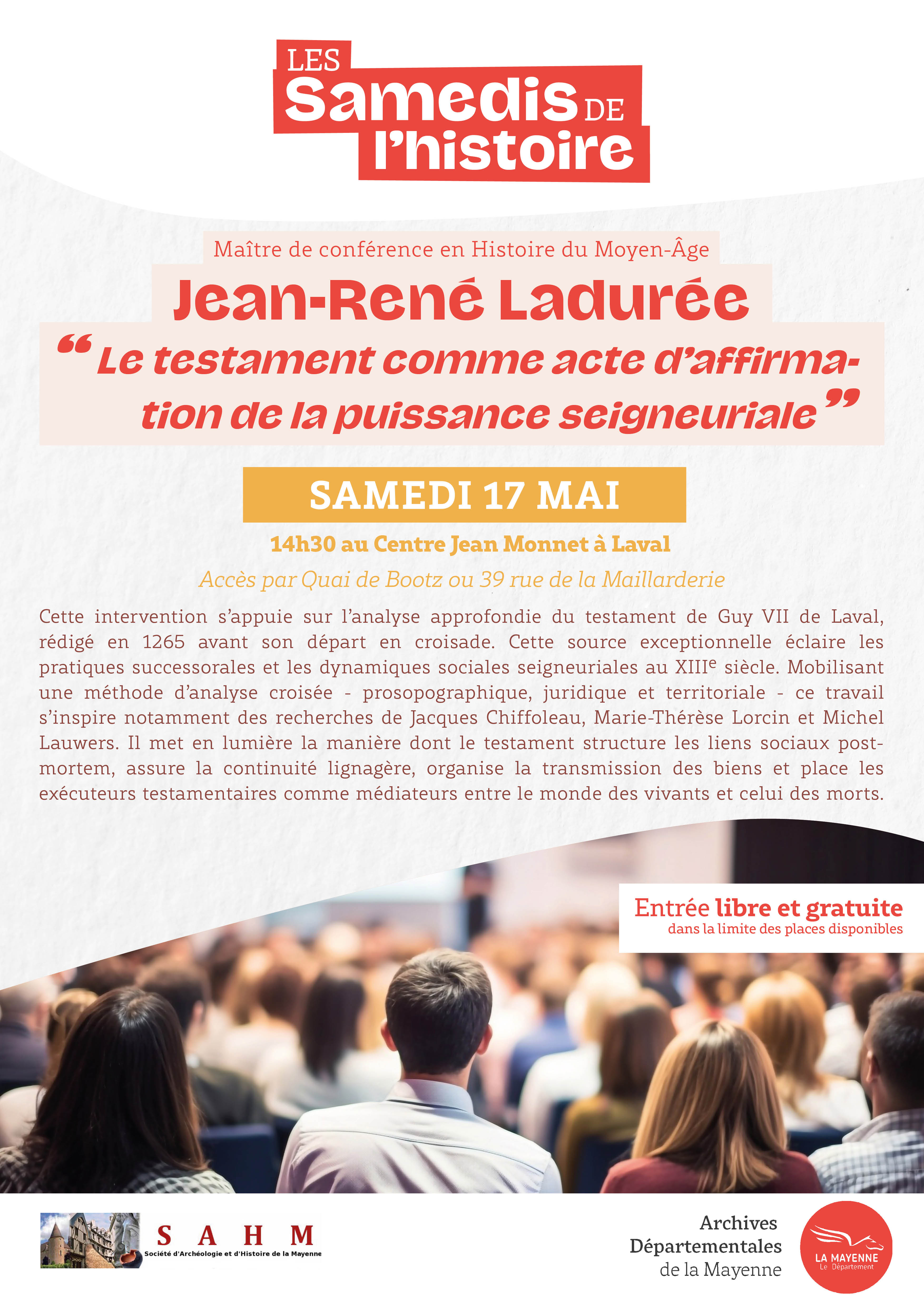 "Le testament comme acte d'affirmation de la puissance seigneuriale : exemple des dernières volontés de Guy VII de Laval au XIIIe siècle" par Jean-René LADUREE, maître de conférence en Histoire du Moyen-Âge.